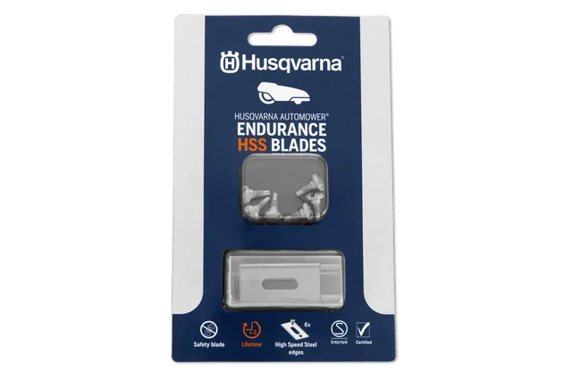 Husqvarna Automower® Endurance HSS 6 pcs blister blades, High-speed steel blades with a softer core and hardened edges for extra sharpness and robustness. The Husqvarna Endurance design allows for cutting edges on all four sides of the blade and a new choice of material provide improved cutting properties. Safety blade according to standards.